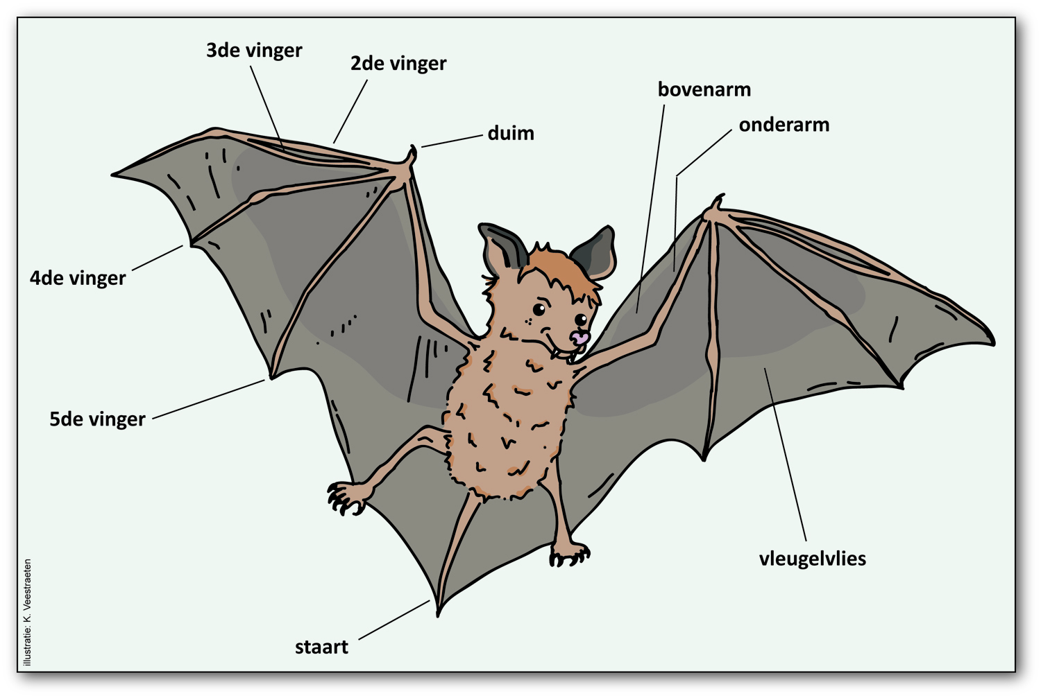 Vleermuizen zijn zoogdieren die kunnen vliegen. Het is het enige zoogdier dat kan vliegen. Ze kunnen vliegen met behulp van vliezen tussen de vingers. Het geheel vormen de vleugels. De vleermuis is een insecteneter. Vleermuizen zijn grijsbruin of rossig bruin van kleur. Ze leggen geen eieren maar baren hun kinderen. Het vrouwtje geeft het kleintje eten. Ook hebben ze eerst melktanden en krijgen pas later hun echte tanden.